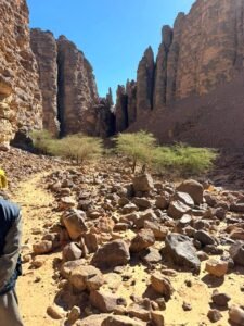 Les ânes sont chargés avec nos sacs et équipements, et nous entamons la deuxième montée vers Tamarit, un site emblématique du Tassili, connu pour ses cyprès millénaires et ses panoramas spectaculaires.